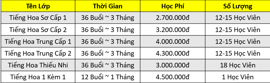 Đặc biệt, có lớp tiếng Hoa 1 kèm 1 với lộ trình học cấp tốc, chỉ sau 1 tháng bạn có thể tự tin giao tiếp bằng tiếng Hoa với các tình huống cơ bản, với mức học phí chỉ từ 4.500.000đ/tháng.